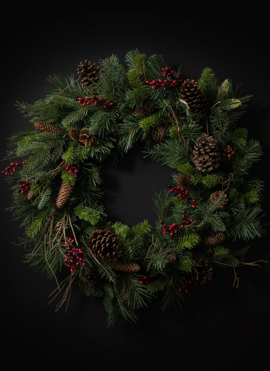 Ghirlanda di Natale, diametro 40 cm, con pino nobilis, Pino Normandiano, bacche rosse, pigne.